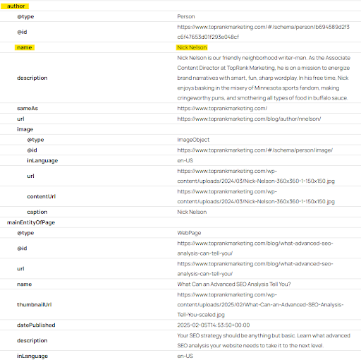 Author schema: Is this type of structured data markup present in the HTML source code of the page?