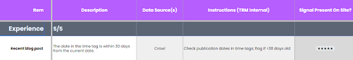 Through this process, we set up and run a series of custom crawls, which check for the presence of various signals on the site, and then run an analysis. A variety of specific criteria are evaluated, resulting in a 1-through-5 score for each E-E-A-T facet, and for the site as a whole.
