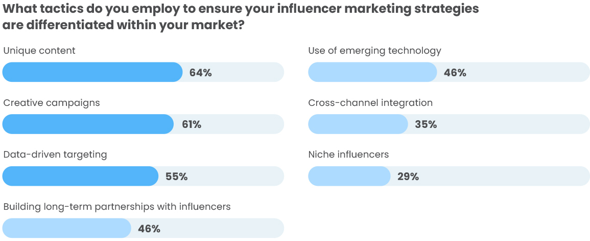 So we wanted to find out: How are marketers striving to differentiate their influencer strategies from the market? We looked at tactics through the lens of those who consider their influencer marketing effective against all others. Some key areas of focus stood out, such as unique content, creative campaigns, data-driven targeting, and an emphasis on long-term relationship-building.