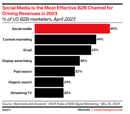 Perhaps the most compelling statistic we’ve found is from Insider Intelligence, which shows that 60% of B2B marketers named social media as the most effective channel for driving revenue.