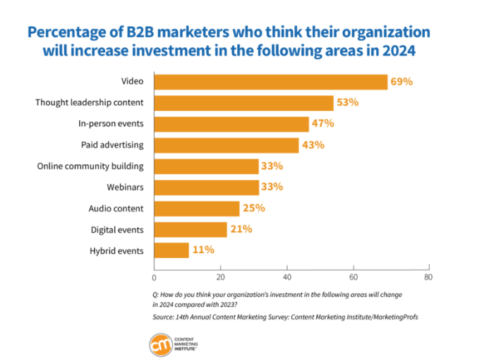 45% of B2B marketers said they expected their content marketing budget to increase in 2024. Video, thought leadership content and in-person events are the top areas of investment. (CMI)