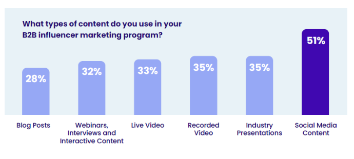 51% of B2B marketers say they create social media content as part of their influencer programs, making it the most popular type of influencer content. (TopRank)