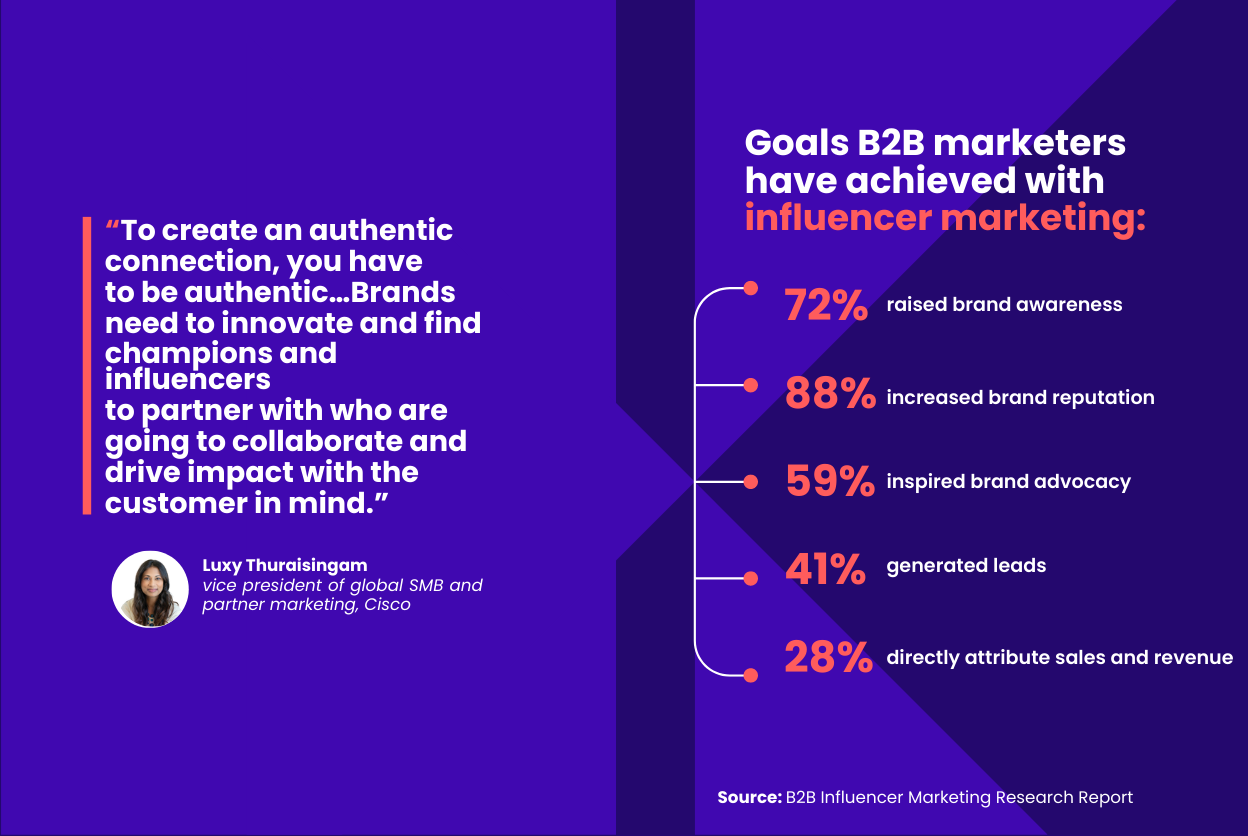 In our survey of B2B marketing leaders, 41% said they generated leads with influencer marketing, and 28% can directly attribute sales and revenue to their efforts. These numbers may be low now, but they prove what’s possible.