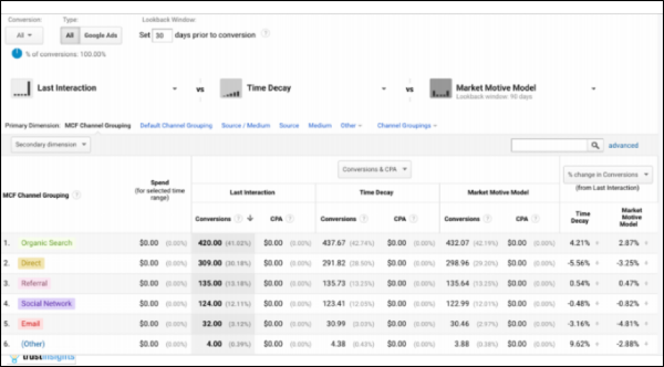 This approach takes more effort but can still be built and tracked in Google Analytics. Within the system, there are options for built-in models to get you started. Users can then navigate to the conversions menu and begin building their own attribution models. For example, you can tag a webinar you hosted and assign it 2x the value of another activity like a social conversion. It’s best to test a few different models and see how they behave.