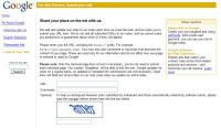 I noticed today that Google is now checking for automated web site submissions on the Google add URL form. When submitting a site Google has added an optional field to enter in a string of characters that dynamically displays on each visit to the page in order to distinguish from manual and automated submissions.